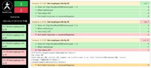 緑が3、赤が2になっており、それぞれ詳細にどこでエラーになったかも確認できます。シナリオ4件目ではAnd match response == expectedResponseレスポンスの内容がテストデータの期待値と一致しなかったことを示しています。
