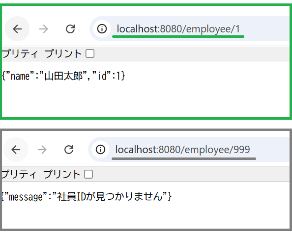 存在するID(1〜3)には200で社員情報を返し、それ以外は404とエラーメッセージを返す仕様です。