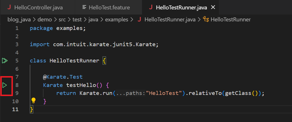 Karate.run(“HelloTest”) の “HelloTest” は .feature ファイル名に対応していますね!