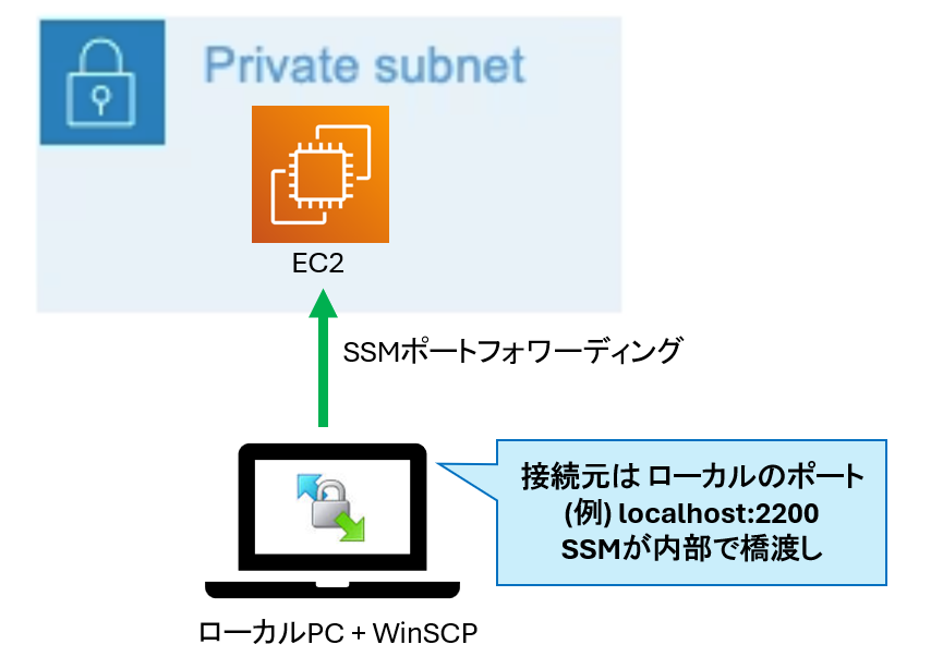 この構成では、ローカルPCからEC2に直接SSH接続するわけではありません。
